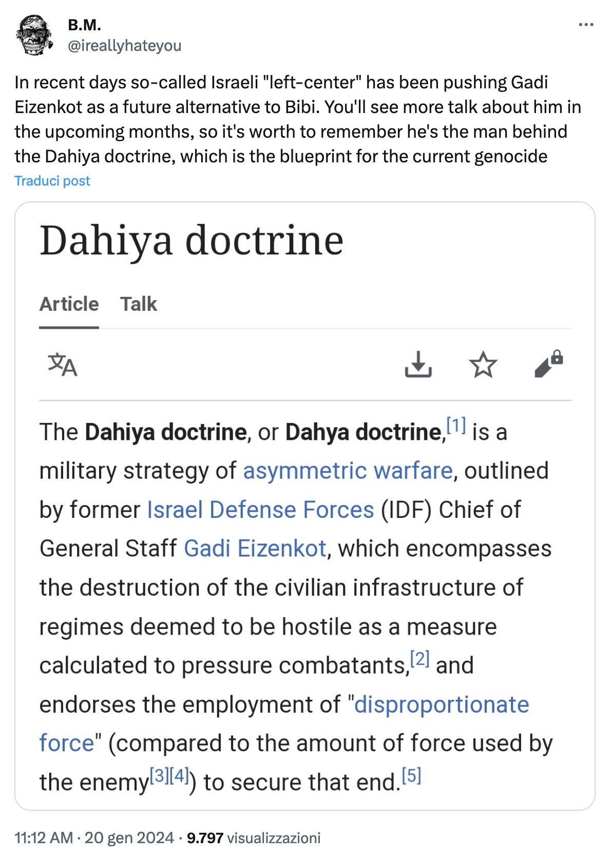 L'altro giorno ho raccolto per un articolo un po' di miei appunti sul padre (ig)nobile della "drottina Dahiya", il criminale italiano Giulio Douhet, e sulla scelta del genocidio come terrore.